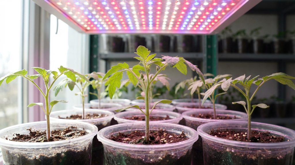 Здоровая рассада томатов под фитолампой с надежным блоком питания демонстрирует крепкие стебли и яркую зелень.
