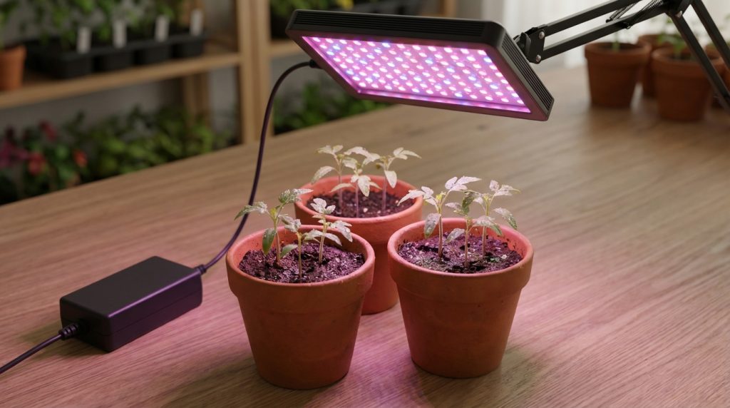 Иллюстрация фитолампы над лотком рассады: стабильный блок питания обеспечивает равномерный свет для здорового роста растений.