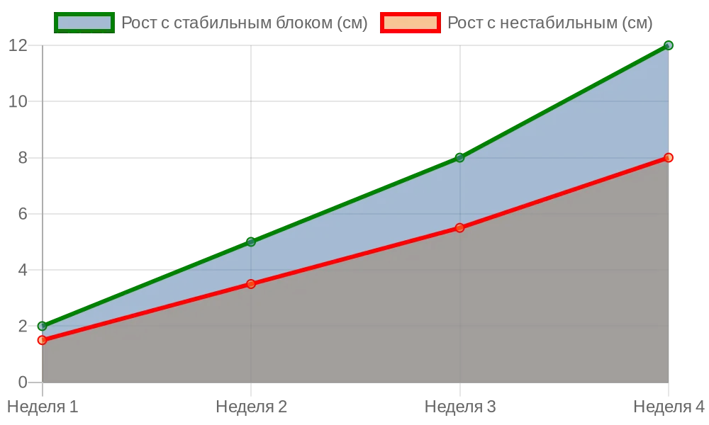 Эта линия диаграммы показывает, как стабильный блок ускоряет развитие высоты растений по неделям, подчеркивая долгосрочную пользу для урожая.
